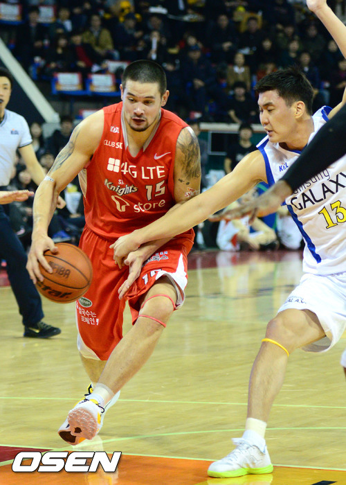 23일 오후 서울 잠실학생체육관에서 열린 'KB 국민카드 2012-2013 프로농구' 서울 SK와 서울 삼성의 경기,2쿼터 SK 김민수가 삼성 유성호의 수비를 피해 골밑 돌파를 시도하고 있다.