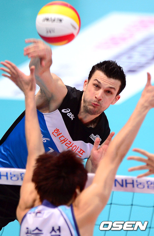 23일 오후 인천 도원체육관에서 열린 '2012-2013 NH농협 V-리그' 남자부 대한항공과 현대캐피탈의 경기, 1세트 현대캐피탈 가스파리니기 스파이크를 때리고 있다.