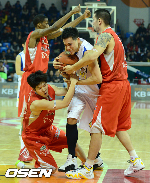 23일 오후 서울 잠실학생체육관에서 열린 'KB 국민카드 2012-2013 프로농구' 서울 SK와 서울 삼성의 경기, 3쿼터 삼성 이동준이 SK선수들과 볼다툼을 하고 있다.