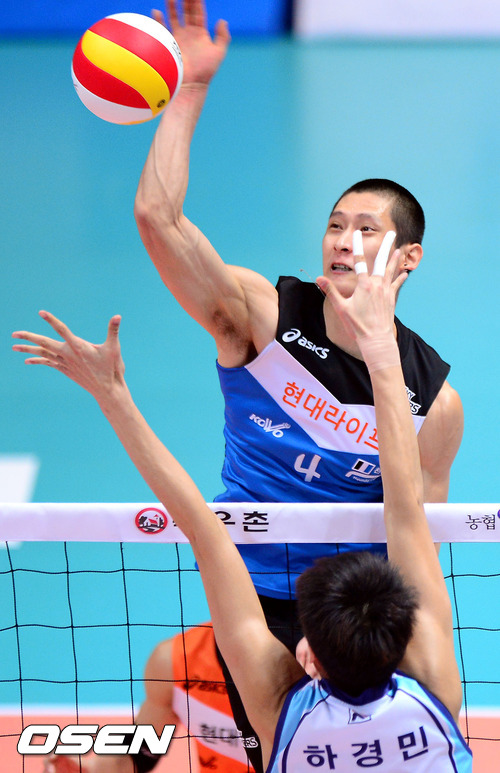23일 오후 인천 도원체육관에서 열린 '2012-2013 NH농협 V-리그' 남자부 대한항공과 현대캐피탈의 경기, 1세트 현대캐피탈 문성민이 대한항공 하경민의 블로킹을 피해 대각선 공격을 시도하고 있다.