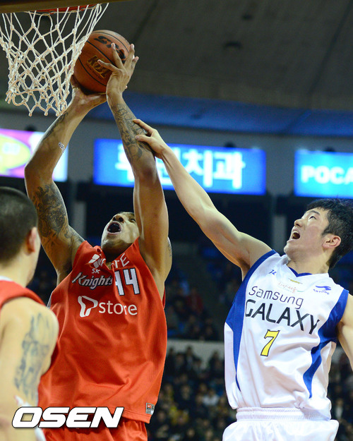 23일 오후 서울 잠실학생체육관에서 열린 'KB 국민카드 2012-2013 프로농구' 서울 SK와 서울 삼성의 경기,2쿼터 SK 심스가 삼성 박병우의 수비를 피해 골밑슛을 시도하고 있다.