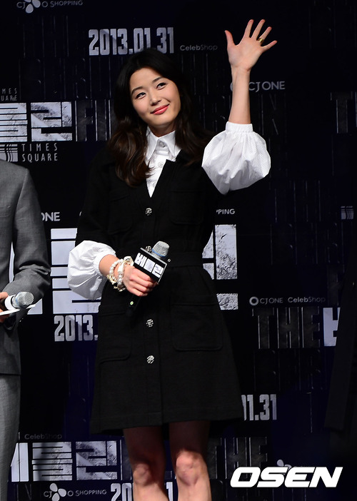 배우 전지현이 팬들을 향해 손인사를 하고 있다.