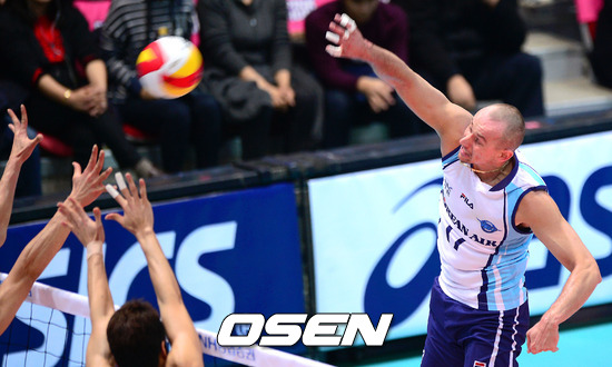 23일 오후 인천 도원체육관에서 열린 '2012-2013 NH농협 V-리그' 남자부 대한항공과 현대캐피탈의 경기, 2세트 대한항공 마틴이 공격을 시도하고 있다.