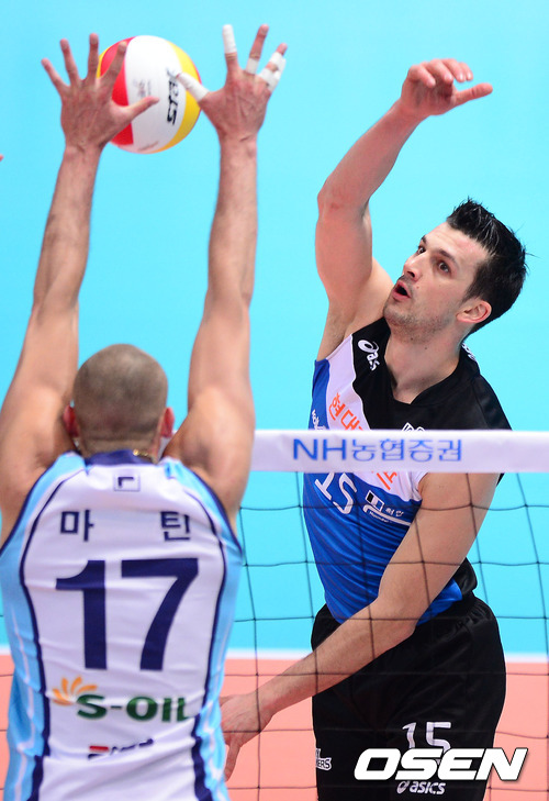 23일 오후 인천 도원체육관에서 열린 '2012-2013 NH농협 V-리그' 남자부 대한항공과 현대캐피탈의 경기, 1세트 현대캐피탈 가스파리니의 스파이크가 대한항공 마틴의 블로킹에 걸리고 있다.