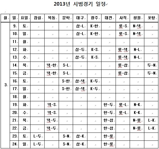 한국야구위원회(KBO)는 프로야구 페넌트레이스 개막에 앞서 거행되는 2013년 시범경기 일정을 확정, 발표했다.