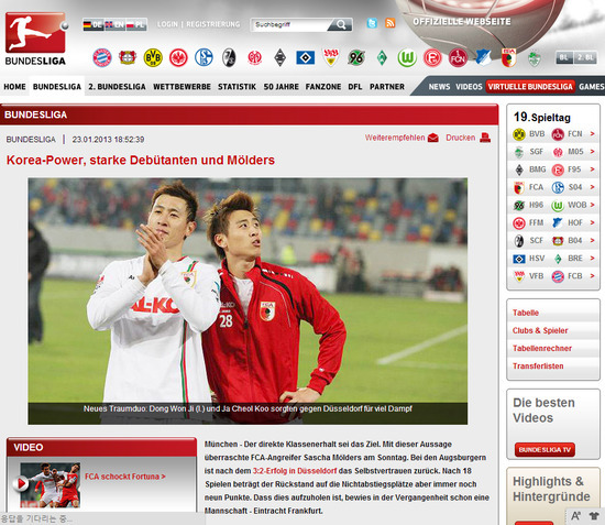 분데스리가 공식 홈페이지는 24일(한국시간) 지난 18라운드를 정리하면서 아우크스부르크가 지난 21일 뒤셀도르프를 상대로 3-2 승리를 거둔 요인 중 하나로 '한국 파워'를 언급했다. 아우크르스부르크 유니폼을 입고 첫 호흡을 맞춘 지동원과 구자철이 나란히 선 사진을 싣고 둘의 활약상을 높게 평가한 것이다.