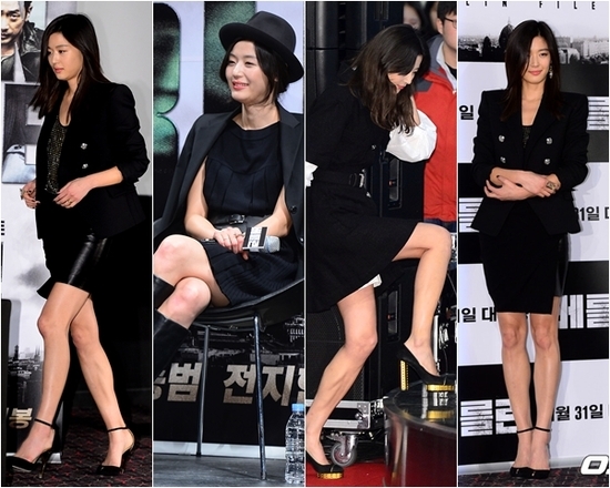 액션 영화 '베를린'에서 맡은 신비로운 배역 때문인지 3번의 행사에 참석한 그가 선택한 의상 코드는 고급스럽고 점잖은 블랙. 그럼에도 그는 무릎 위로 올라오는 중간 길이의 스커트를 선택해 시원한 각선미를 드러냈다.