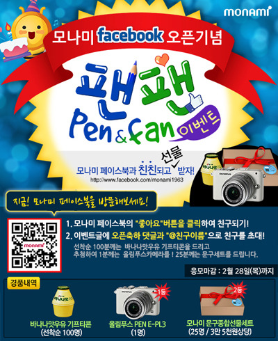 공식 페이스북 오픈 기념으로 준비된 이번 팬팬 이벤트 참여는 모나미 페이스북 페이지를 방문해 ‘좋아요’ 버튼을 클릭해 친구를 맺은 뒤 이벤트 글 밑에 오픈 기념 축하 댓글과 함께 ‘@친구이름’을 기입해 친구를 초대하면 된다.