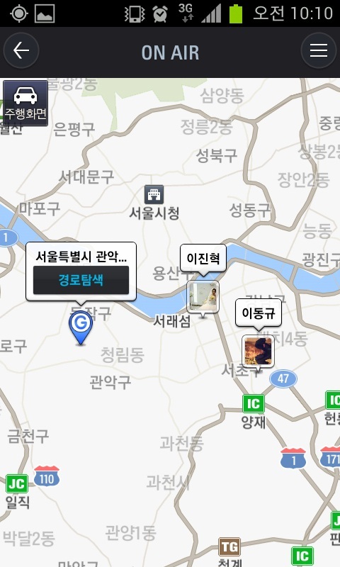 아이나비 AIR for Kakao 그룹 주행 화면.