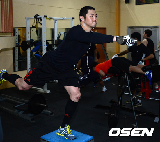 롯데 박종윤이 24일 밤(현지시간) 사이판의 한 실내체육관에서 근력운동을 하고 있다.