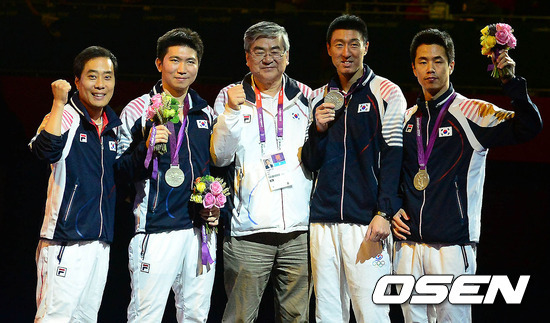 조양호 대한탁구협회장과 2012 런던 올림픽 탁구 남자 단체전 출전 선수들.