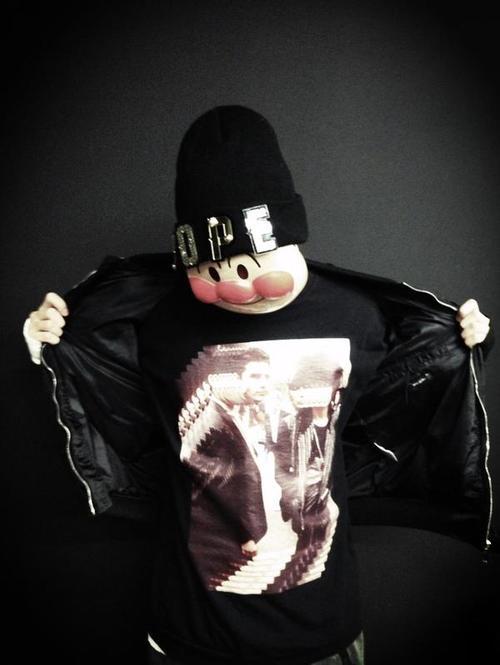 사진 속 지드래곤은 볼과 코가 빨간 호빵맨 탈을 쓰고 있다. 능청스러운 표정의 호빵맨 얼굴에 검정색 점퍼를 입고 털모자를 눌러쓴 채 포즈를 취하고 있는 지드래곤의 엉뚱한 모습이 웃음을 자아낸다.