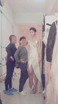 사진 속 한지혜는 하얀색의 드레스를 입고 스태프들과 포즈를 취한 채 서 있다. 옆에 있는 두 명의 스태프들을 훌쩍 뛰어 넘는 큰 키가 이목을 집중시키는 모습이다.