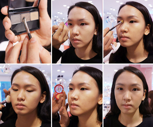 “눈썹을 그리고 난 뒤, 본격적으로 섀딩을 하면 됩니다. 먼저 눈앞머리에 이어지도록 섀딩을 합니다. 코끝까지 길게 이어지는 섀딩은 자칫 나이가 들어 보일 수 있으니 피하세요. 다음단계는 트라이앵글 바깥부분의 톤을 다운 시키는 것입니다. 트라이앵글 라인은 양쪽 광대와 턱을 중심으로 그릴 수 있는 역삼각형 모양을 말합니다. 마무리로 하이라이터를 이용해 T존과 C존 부위를 가볍게 밝혀주면 더 좋습니다.”