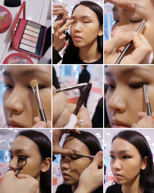 “아이메이크업 전 크림섀도로 눈두덩이에 베이스 메이크업을 해주면 훨씬 발색력이 좋습니다. 덧붙여 아이라인을 그릴 때에는 점막까지 칠할 필요가 없습니다. 대신 속눈썹 사이 사이를 메꿔준다는 느낌으로 가볍게 칠할 것을 권장합니다.”