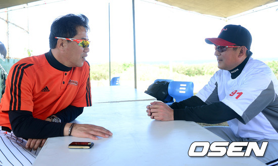 25일 오전(현지시간) 사이판 롯데 훈련장에서 롯데 김시진 감독과 LG 김기태 감독이 이야기를 나누고 있다.
