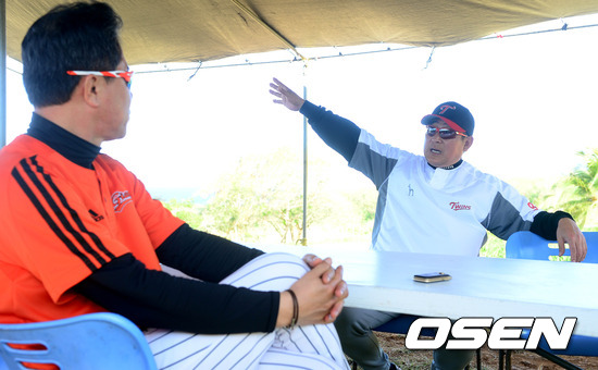 25일 오전(현지시간) 사이판 롯데 훈련장에서 롯데 김시진 감독과 LG 김기태 감독이 이야기를 나누고 있다.