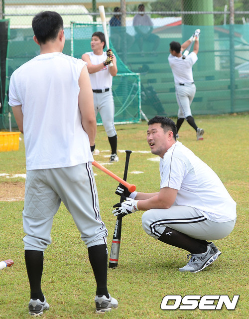 25일 오전(현지시간) 사이판 수수페 구장에서 LG 최동수와 정성훈이 훈련 중 이야기를 나누고 있다.