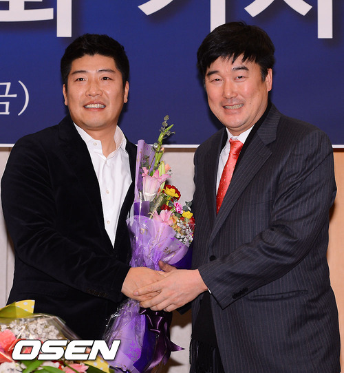25일 오후 서울 마포가든호텔에서 진행된 박재홍(전 SK 와이번스)의 은퇴 기자회견에서 박재홍이 SK 민경삼 단장에게 꽃다발을 받고 있다