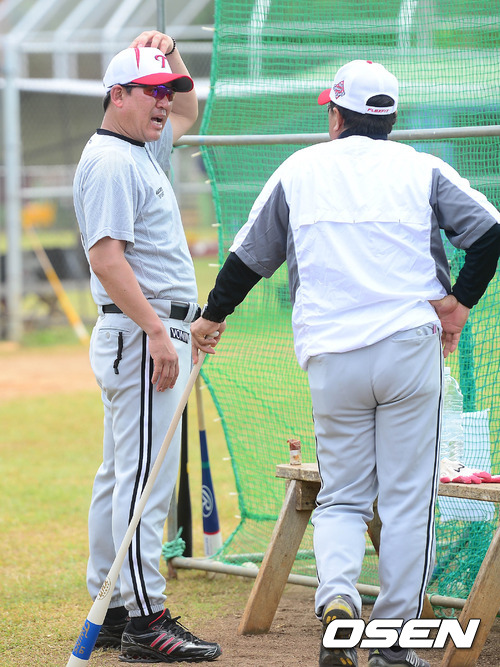 25일 오전(현지시간) 사이판 수수페 구장에서 LG 조계현 수석코치와 김무관 코치가 이야기를 나누고 있다.
