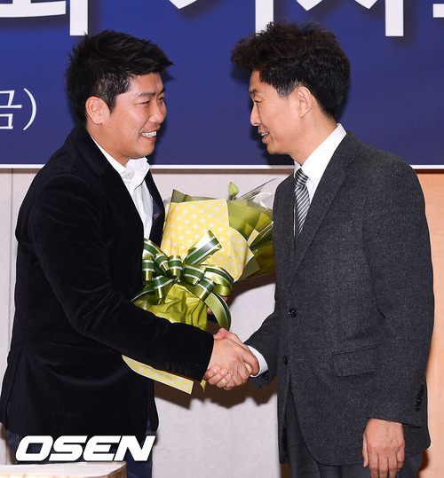 25일 오후 서울 마포가든호텔에서 진행된 박재홍(전 SK 와이번스)의 은퇴 기자회견에서 박재홍이 일구회 구경백 사무총장에게 꽃다발을 받고 있다