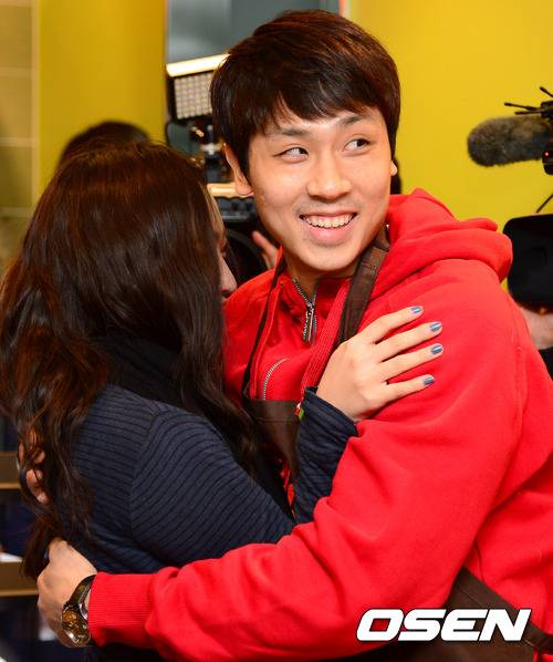 KGC 김태술이 여성 팬과 포옹을 하고 있다.