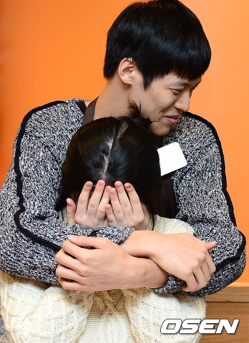 SK 김선형이 여성 팬과 포옹을 하고 있다.