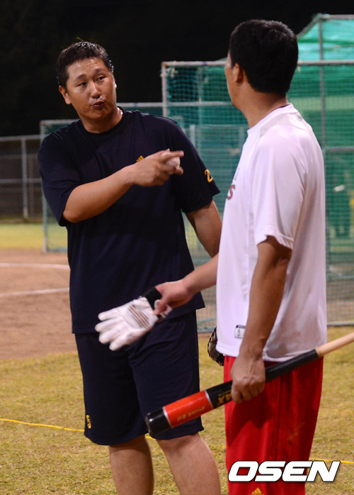 25일 오후(현지시간) 사이판 수수페 구장에서 이대호가 훈련을 마치고 떠나는 이병규와 이야기를 하고 있다.