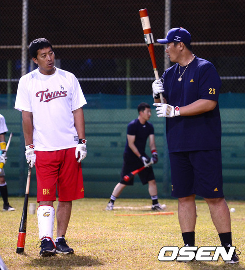 25일 오후(현지시간) 사이판 수수페 구장에서 이병규와 이대호가 훈련 중 이야기를 나누고 있다.