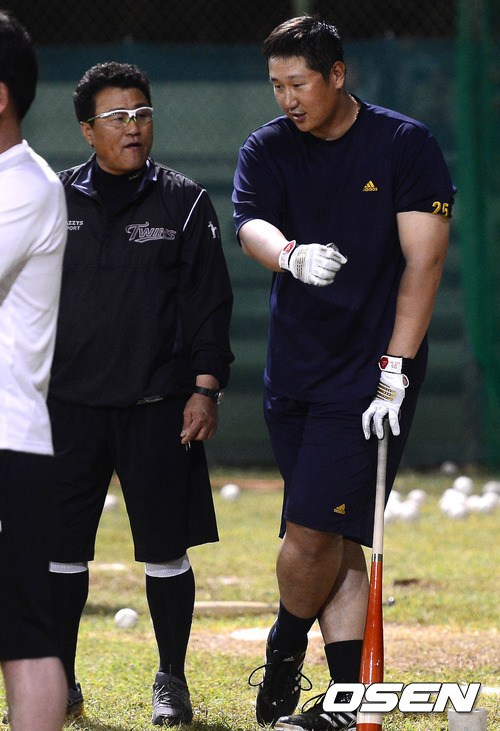 25일 오후(현지시간) 사이판 수수페 구장에서 이대호가 LG 김무관 코치와 이야기를 나누고 있다.