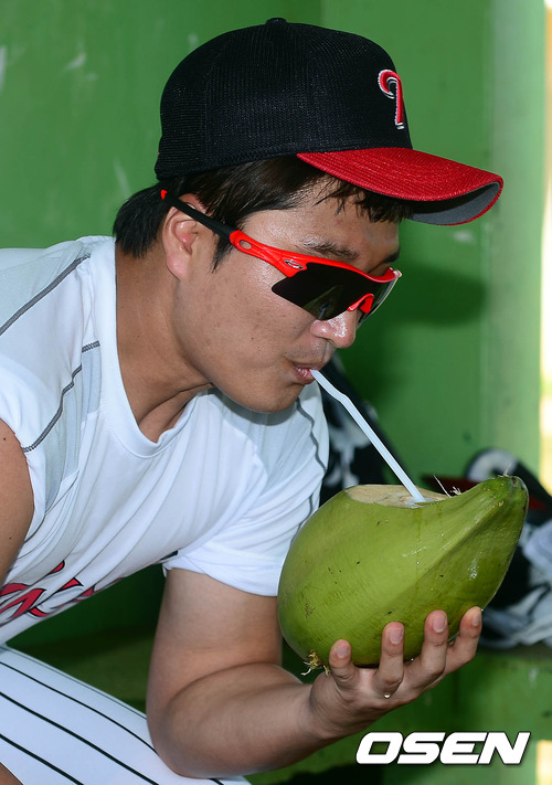 26일 오전(현지시간) 사이판 수수페 구장에서 LG 이진영이 휴식 중 코코넛을 먹고 있다.