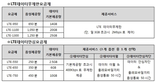 아울러 기존 국내 유일 망내무료통화와 데이터이월을 제공하는 ‘LTE 550/650/750 요금제’에 “데이터 안심” 서비스를 더해 선택권을 넓혔다.