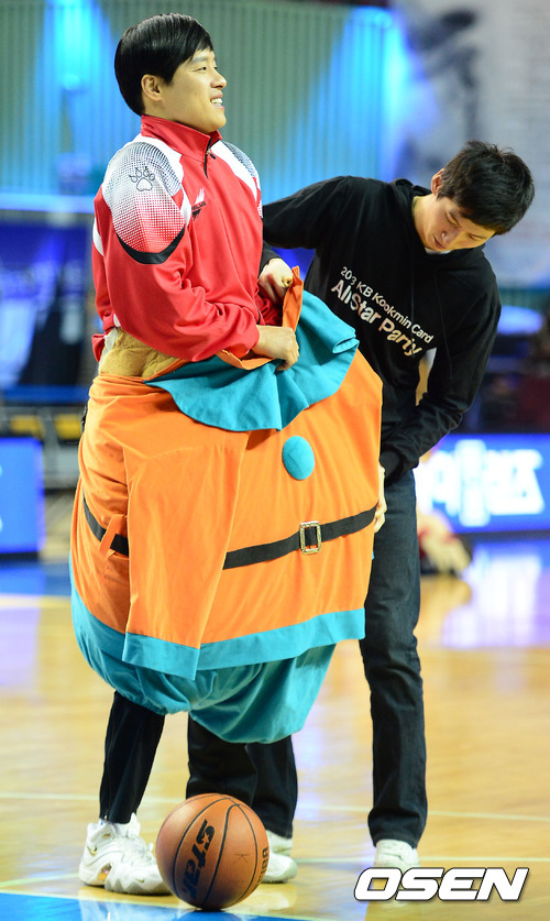 26일 오후 서울 잠실 실내체육관에서 열린 KB 국민카드 2012-2013 레전드 올스타전에서 명랑 운동회 중 드림팀 우지원이 독특한 옷을 입고 있다.