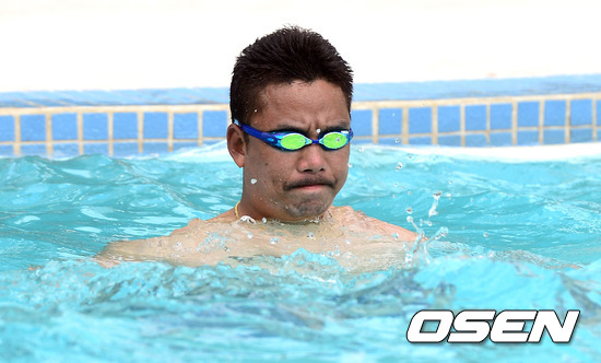 26일 오후(현지시간) 사이판 롯데 숙소 야외수영장에서 김사율이 회복훈련을 하고 있다.