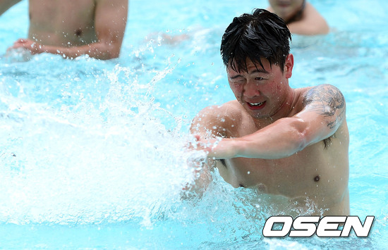 26일 오후(현지시간) 사이판 롯데 숙소 야외수영장에서 진명호가 회복훈련 중 물장구를 치고 있다.