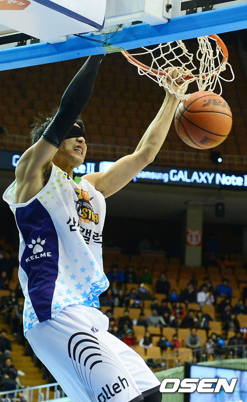 26일 오후 서울 잠실 실내체육관에서 열린 KB 국민카드 2012-2013 레전드 올스타전 하프타임에 덩크슛 콘테스트에서 김현민이 눈을 가리고 덩크를 내리꽂고 있다.