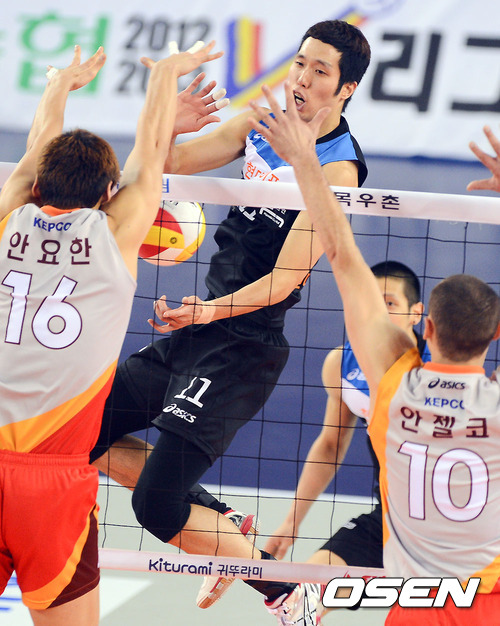 2세트 현대캐패탈 최민호가 KEPCO 안요한의 블로킹에 걸리고 있다./ soul1014@osen.co.kr