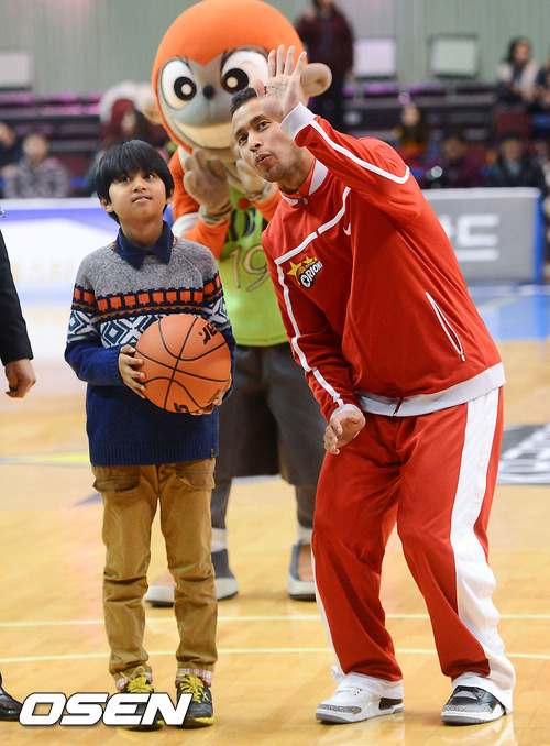 27일 오후 서울 잠실실내체육관에서 진행된 'KB 국민카드 2012~2013시즌 프로농구 올스타전 시전 행사에서 전태풍이 아역배우 지대한에게 슛 하는 방법을 지도하고 있다