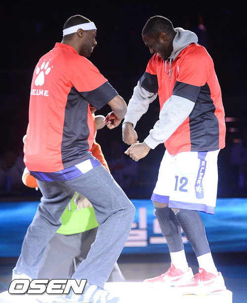 27일 오후 서울 잠실실내체육관에서 진행된 'KB 국민카드 2012~2013시즌 프로농구 올스타전, 식전 행사에서 후안 파틸로와 로드 벤슨이 춤을 추고 있다