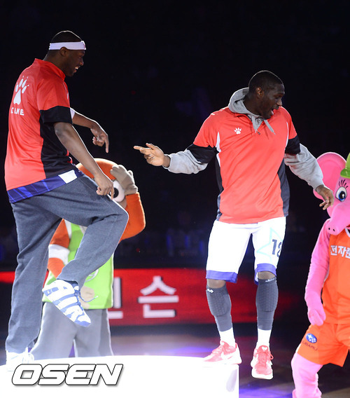 27일 오후 서울 잠실실내체육관에서 진행된 'KB 국민카드 2012~2013시즌 프로농구 올스타전, 식전 행사에서 후안 파틸로와 로드 벤슨이 춤을 추고 있다