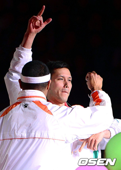 27일 오후 서울 잠실실내체육관에서 진행된 'KB 국민카드 2012~2013시즌 프로농구 올스타전, 식전행사에서 문태종과 이승준이 댄스를 선보이고 있다.