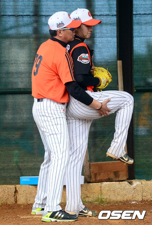 27일 오후(현지시간) 사이판 롯데 훈련장에서 김시진 감독이 정태승에게 자세를 고쳐주고 있다.
