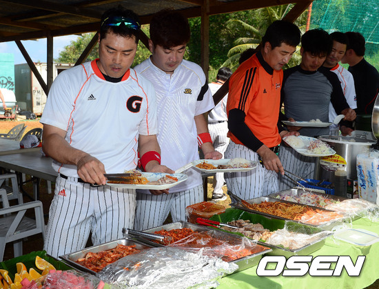 27일 오후(현지시간) 사이판 롯데 훈련장에서 롯데 선수들이 점심식사를 하고 있다.