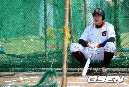27일 오후(현지시간) 사이판 롯데 훈련장에서 황재균이 타격훈련 중 휴식을 취하고 있다.