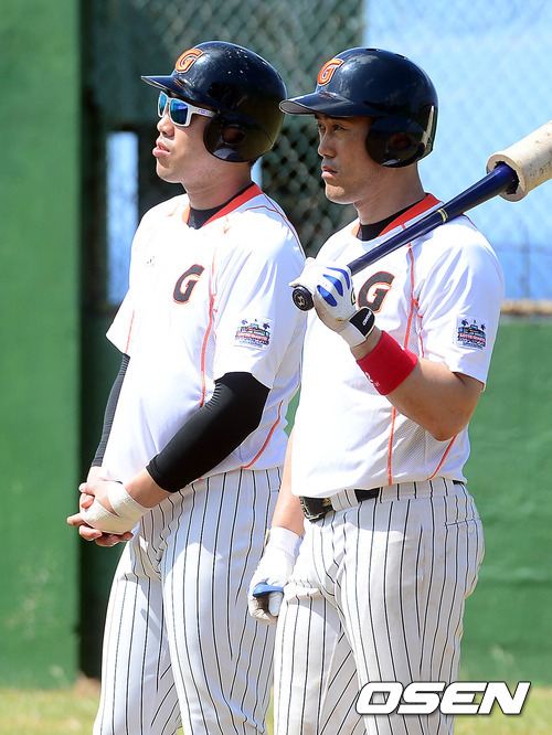 27일 오후(현지시간) 사이판 롯데 훈련장에서 전준우 조성환이 동료들의 타격훈련을 지켜보고 있다.