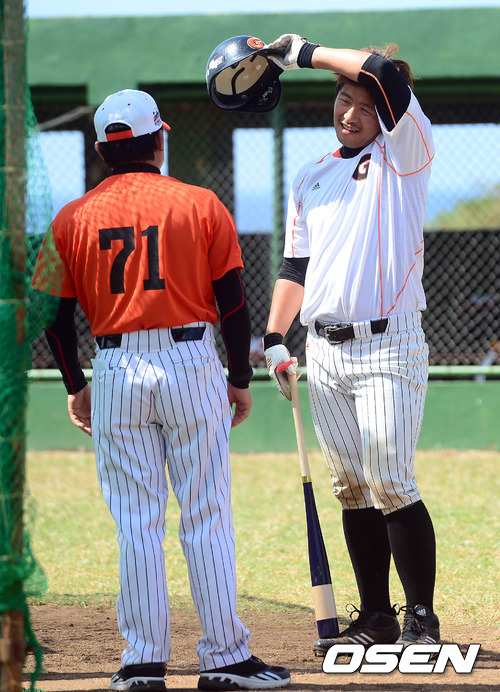 27일 오후(현지시간) 사이판 롯데 훈련장에서 강민호가 박흥식 코치와 이야기를 나누고 있다.