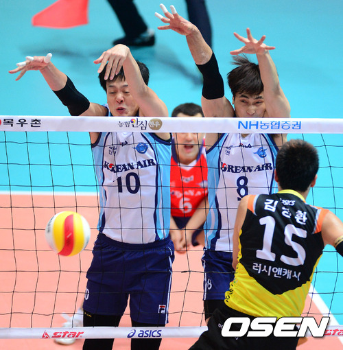 27일 오후 인천 도원체육관에서 열린 '2012-2013 NH농협 V-리그' 남자부 대한항공과 러시앤캐시의 경기, 2세트 대한항공 이영택이 러시앤캐시 김정환의 공격을 블로킹으로 차단하고 있다.