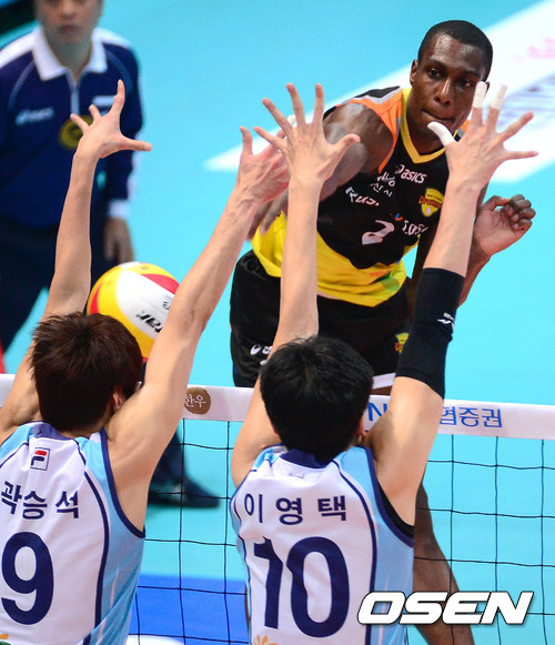 27일 오후 인천 도원체육관에서 열린 '2012-2013 NH농협 V-리그' 남자부 대한항공과 러시앤캐시의 경기, 1세트 러시앤캐시 다미가 대한항공의 블로킹 벽을 피해 스파이크를 날리고 있다.