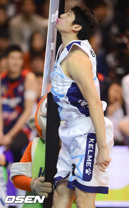 27일 오후 서울 잠실실내체육관에서 진행된 'KB 국민카드 2012~2013시즌 프로농구 올스타전, 3쿼터 키스의 신 이벤트 행사에서 양희종이 입술에 립스틱을 바른채 보드판에 키스 시도하고 있다