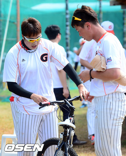 27일 오후(현지시간) 사이판 롯데 훈련장에서 조정훈과 진명호가 숙소로 타고 갈 자전거를 살펴보고 있다.